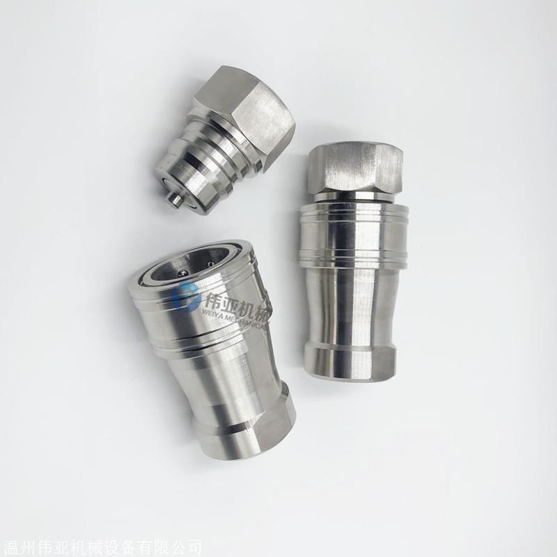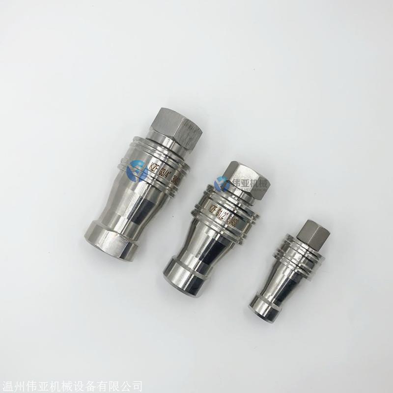 1.开闭快速接头的主要特点是在插入轴和插入套筒的内孔中设立了一个止回阀。连接连接器时,将插入套筒的套圈推到最右边,然后然后将插入轴的头部推入插入套筒的内孔。这时,插入轴和插入套筒中的阀芯相互作用并互相离去。锥形阀座打开,并且插入轴和插入套筒连接。当插入轴的头部插入末端时,可以松开卡套。卡套在弹簧力的作用下回到其原始位置。卡套在赶回原位的过程中将钢球推入刀片轴上的梯形槽中,并将球固定在梯形槽中以产生自锁效用,从而将刀片轴锁定在刀片中套筒孔且不会脱落,从而实现快速连接;同时,塞头头部外圈上有一个o形圈,以实现轴向密封,从而内部流体不会泄漏。要使接头的两边脱开,只需将套圈向右推究竟即可。此时,在接头内部的阀芯的弹簧力的作用下,插塞轴自动从套筒孔淡出,阀芯效用在弹簧上。快速关闭阀座端口,使接头内的流体不会向外泄漏,从而达到快速分离并防范内部流体泄漏的目的。