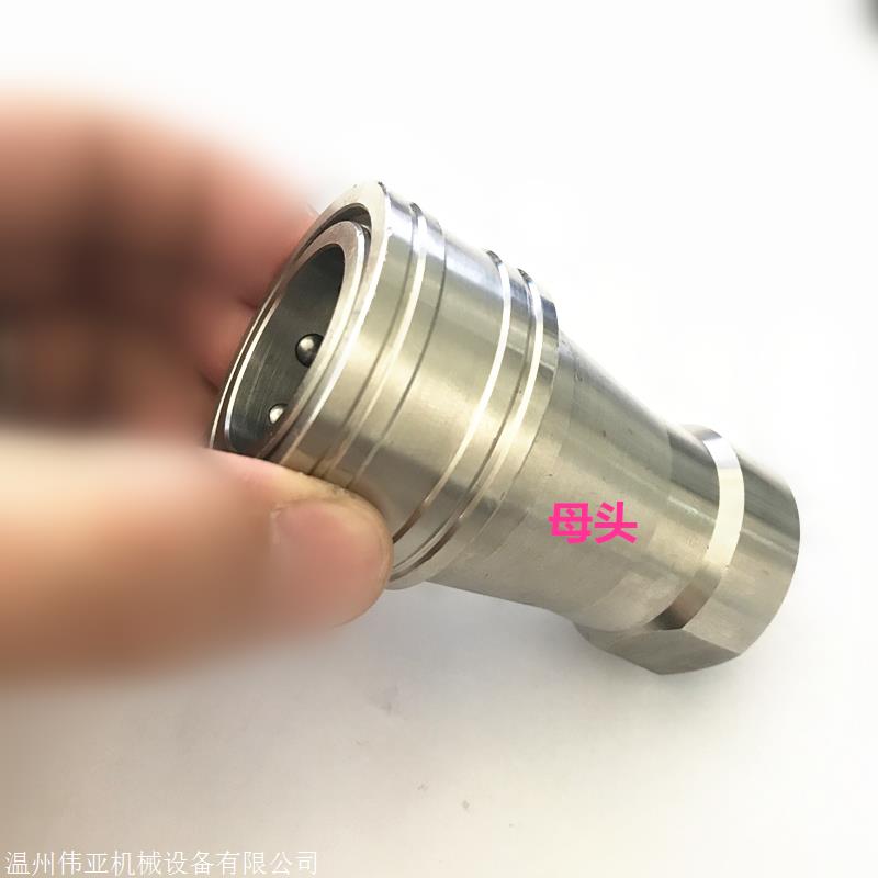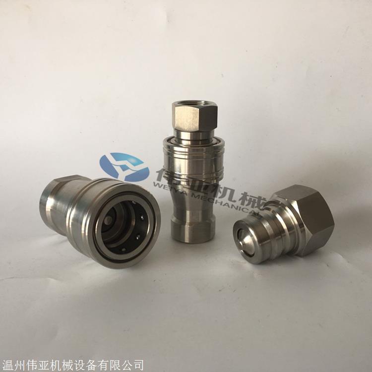 1.开闭快速接头的主要特性是在插入轴和插入套筒的内孔中设立了一个止回阀。连接连接器时,将插入套筒的套圈推到最右边,然后然后将插入轴的头部推入插入套筒的内孔。这时,插入轴和插入套筒中的阀芯相互作用并互相离去。锥形阀座打开,并且插入轴和插入套筒连接。当插入轴的头部插入末端时,可以松开卡套。卡套在弹簧力的作用下回到其原始位置。卡套在回到原位的过程中将钢球推入刀片轴上的梯形槽中,并将球固定在梯形槽中以产生自锁效用,从而将刀片轴锁定在刀片中套筒孔且不会脱落,从而实现快速连接;同时,塞头头部外圈上有一个o形圈,以实现轴向密封,从而内部流体不会泄漏。要使接头的两边脱开,只需将套圈向右推究竟即可。此时,在接头内部的阀芯的弹簧力的作用下,插塞轴自动从套筒孔淡出,阀芯效用在弹簧上。快速关闭阀座端口,使接头内的流体不会向外泄漏,从而达到快速分离并预防内部流体泄漏的目的。
